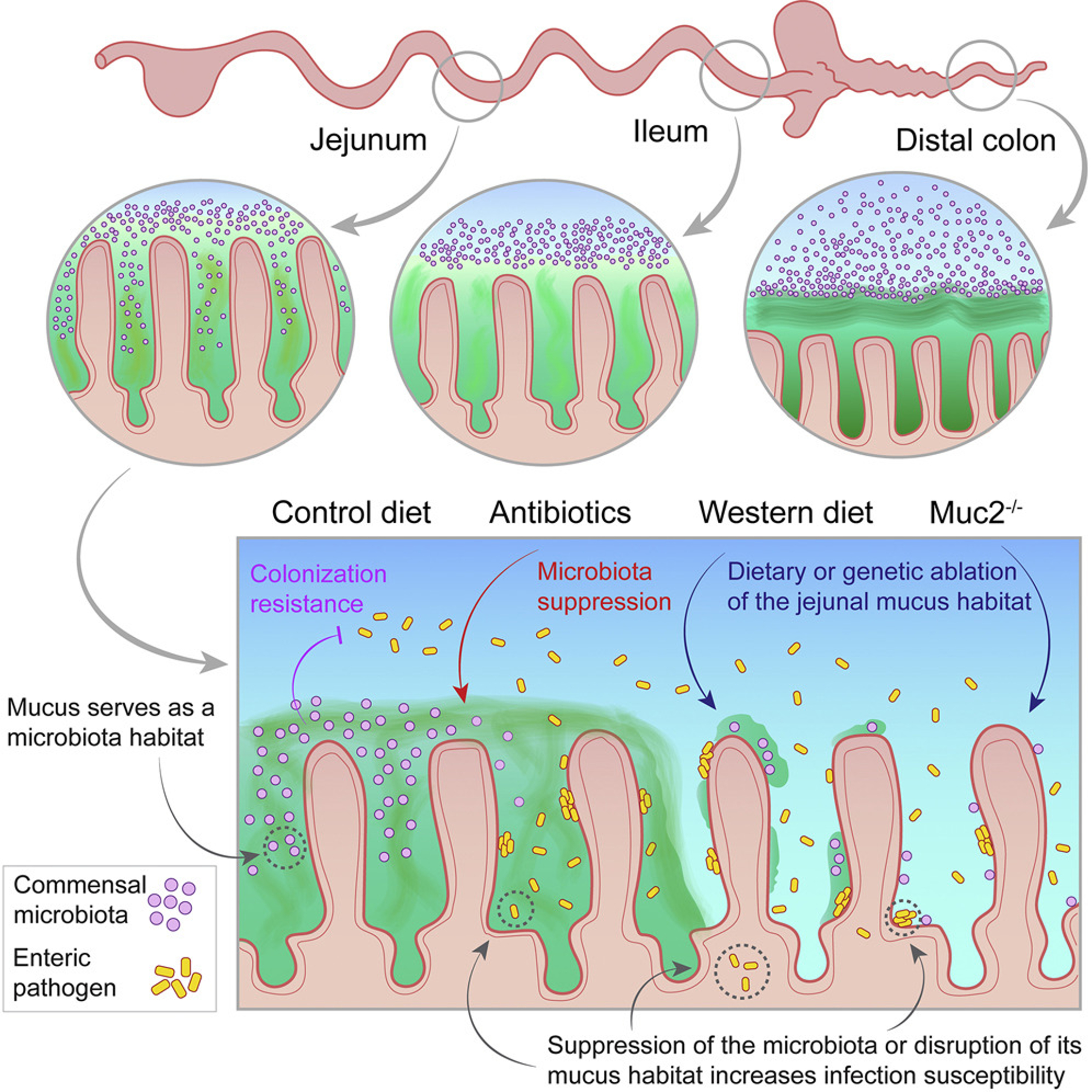 Study from our lab published in Cell Reports identifying a novel role for jejunal mucus in supporting colonisation resistance in the small intestine. Our work provides evidence of mucus acting as a habitat for protective bacteria, rather than acting solely as a barrier mechanism.